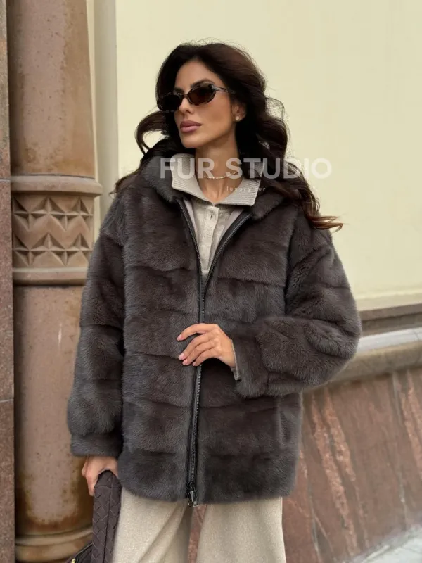 Материал выбранной модели — аукционная норка, доступна в цвете серый. Куртка предлагается в разнообразии размеров, от S до XL, а ее длина составляет 65-70 см, что выигрышно подчеркивает вашу фигуру. Этот вариант идеально подходит для тех, кто ценит роскошь и утонченность натуральных материалов.