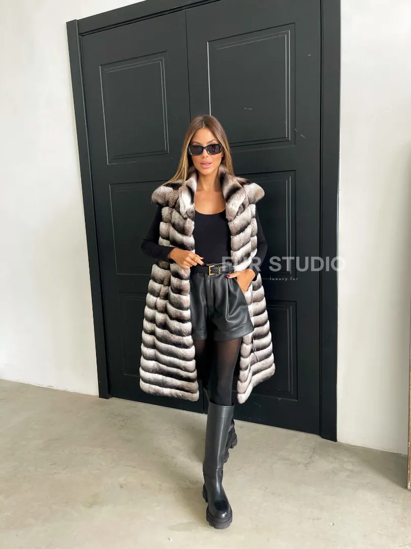 Жилет из меха орилага – отличный вариант для девушек, у кого ограничен бюджет. Изделие никогда не выйдет из моды. Удлиненный жилет зрительно увеличивает рост владелицы. Оригинальная расцветка подчеркнет роскошный оттенок волос и глаз хозяйки. Прямой крой сроет недостатки фигуры. Роскошный воротник позаботится о комфорте шеи и сделает акцент на ее грациозности.